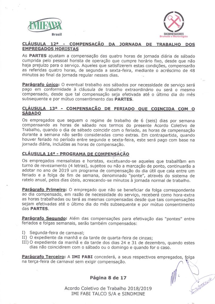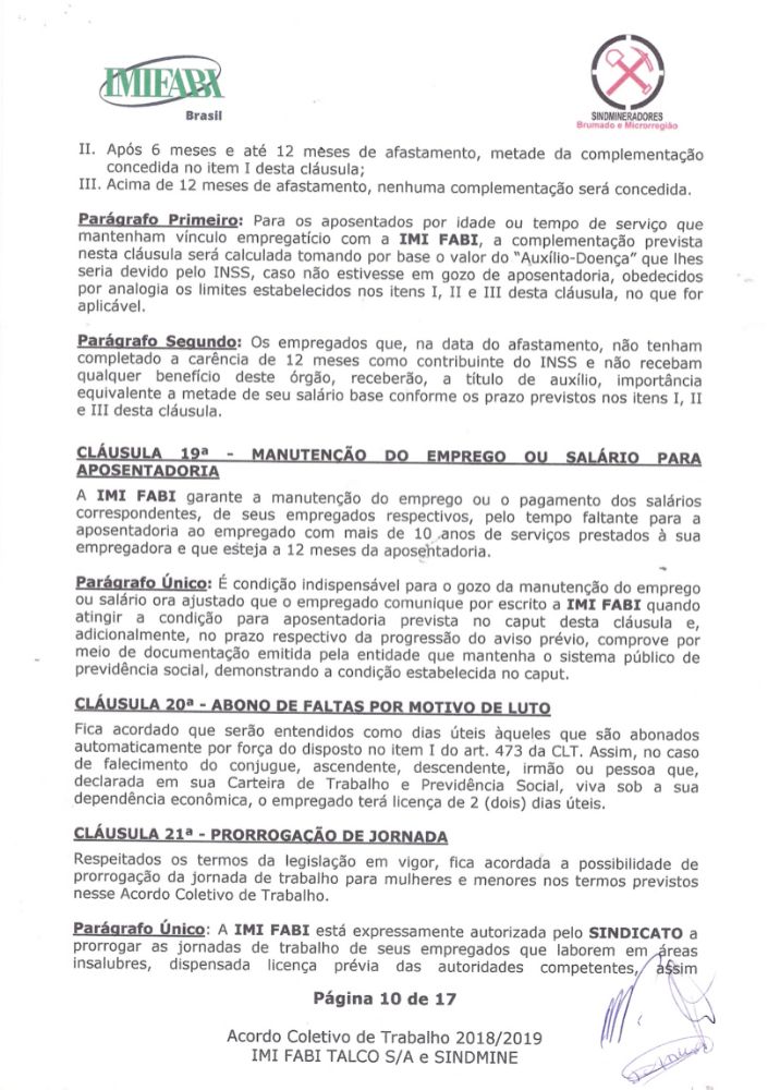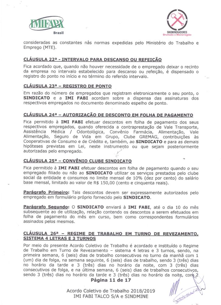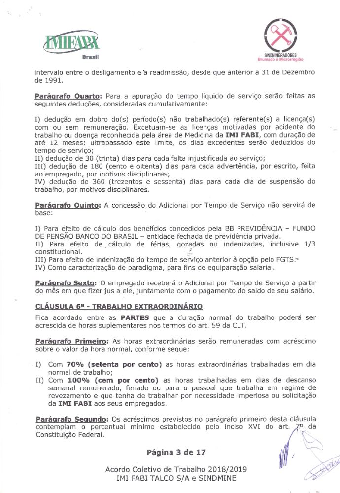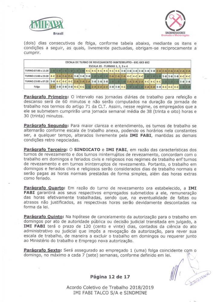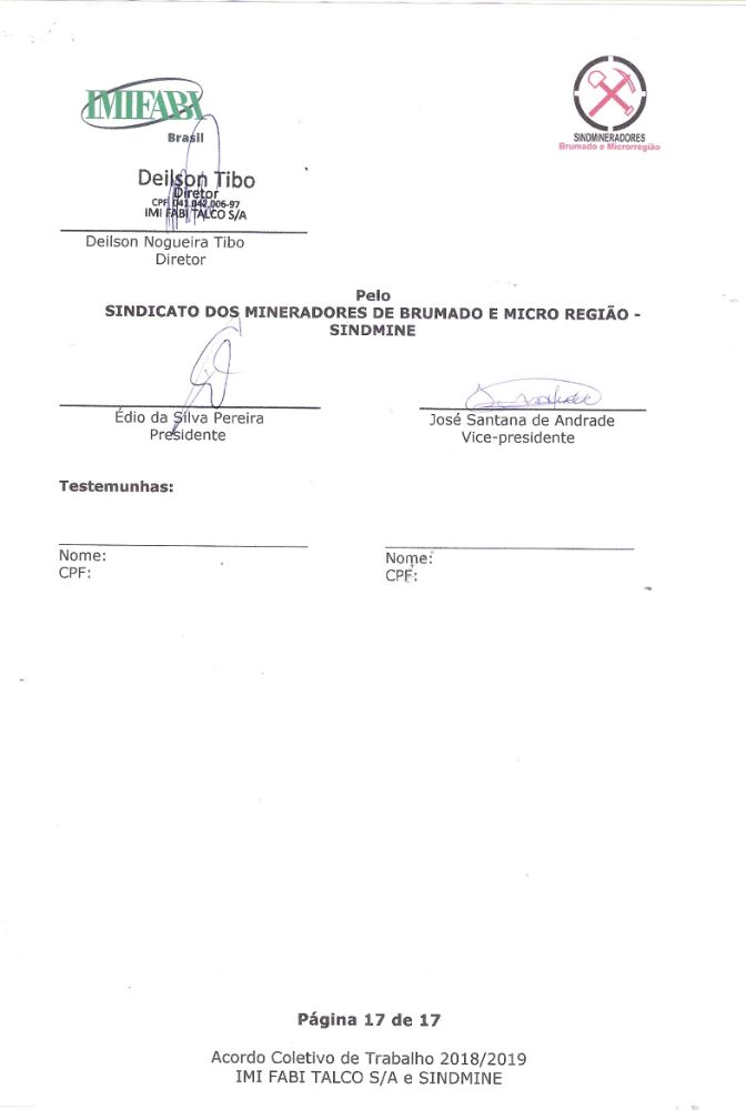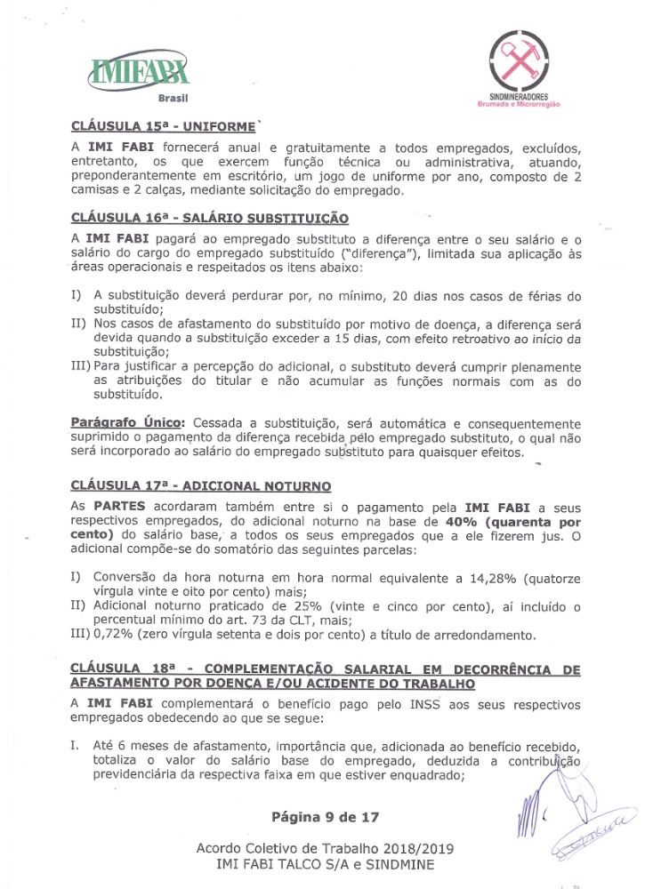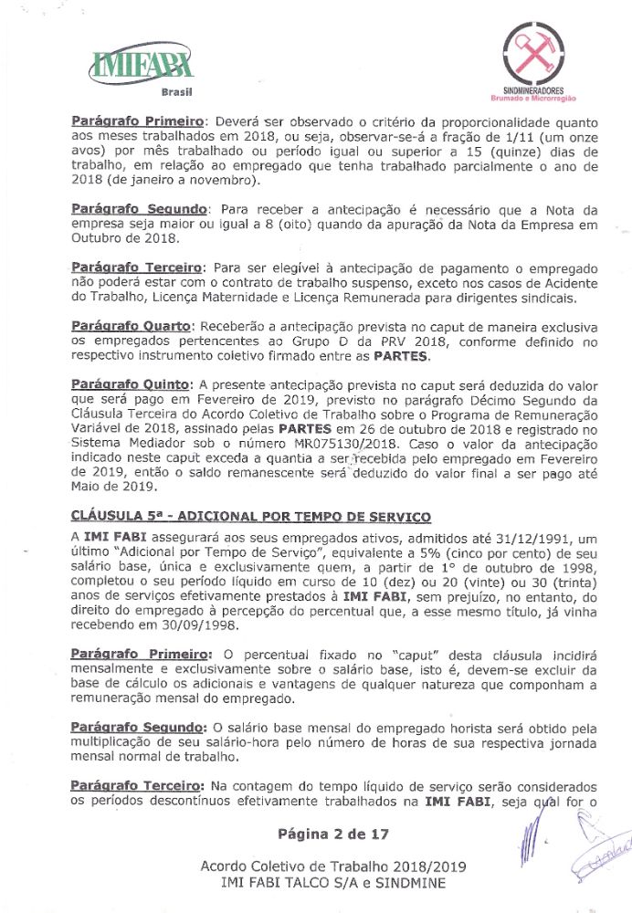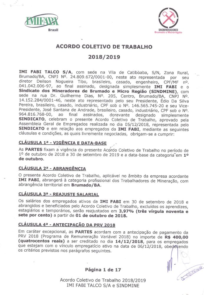 Acordo Coletivo de Trabalho - 2018/2019 - IMI Fabi Talco S/A