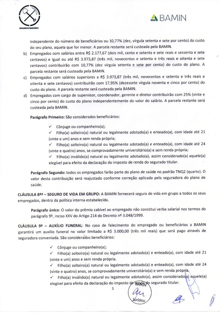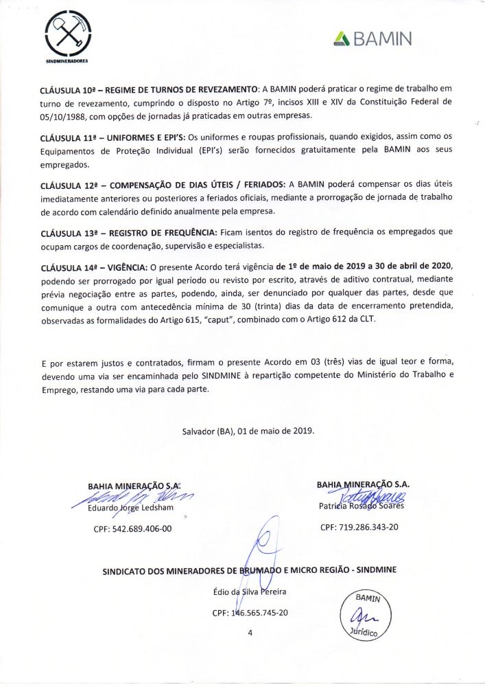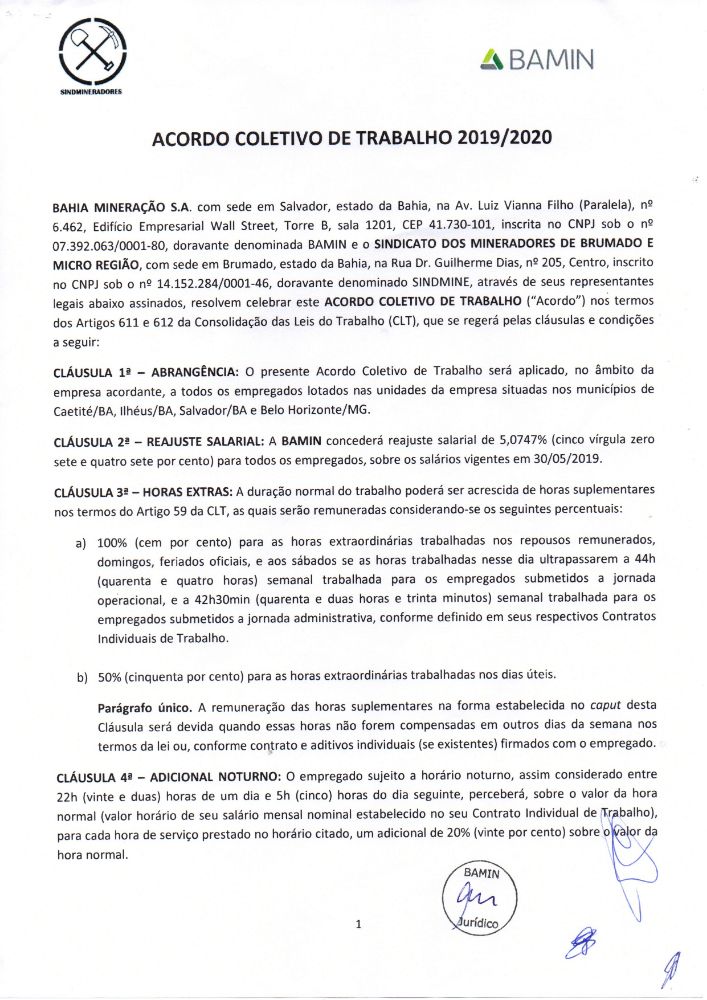 Acordo coletivo de trabalho 2019/2020 - Bahia Mineração S.A