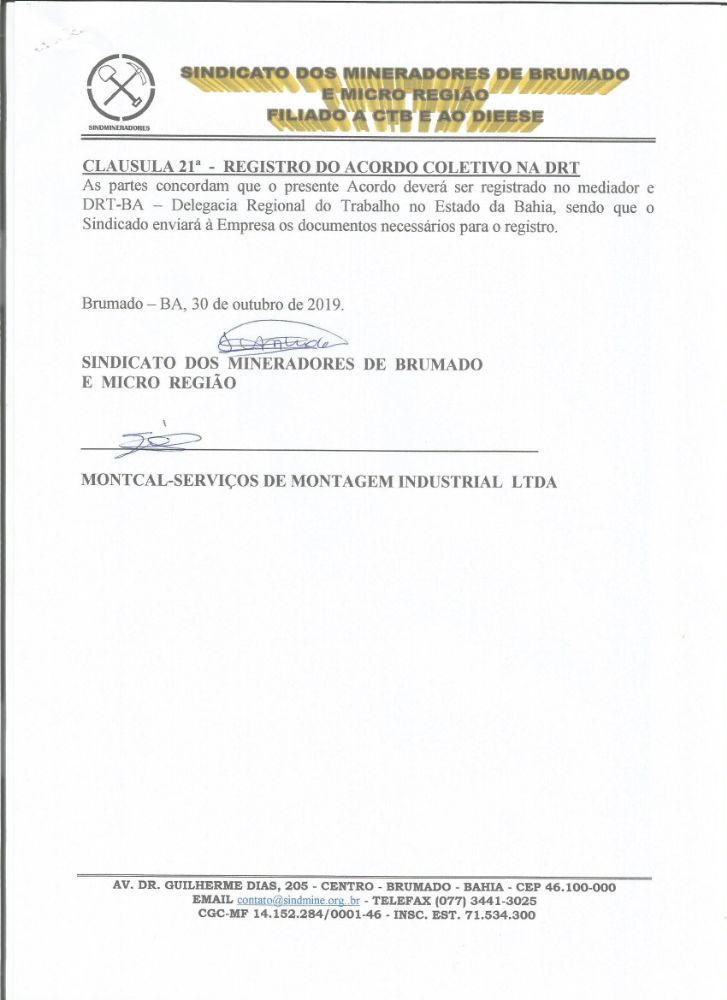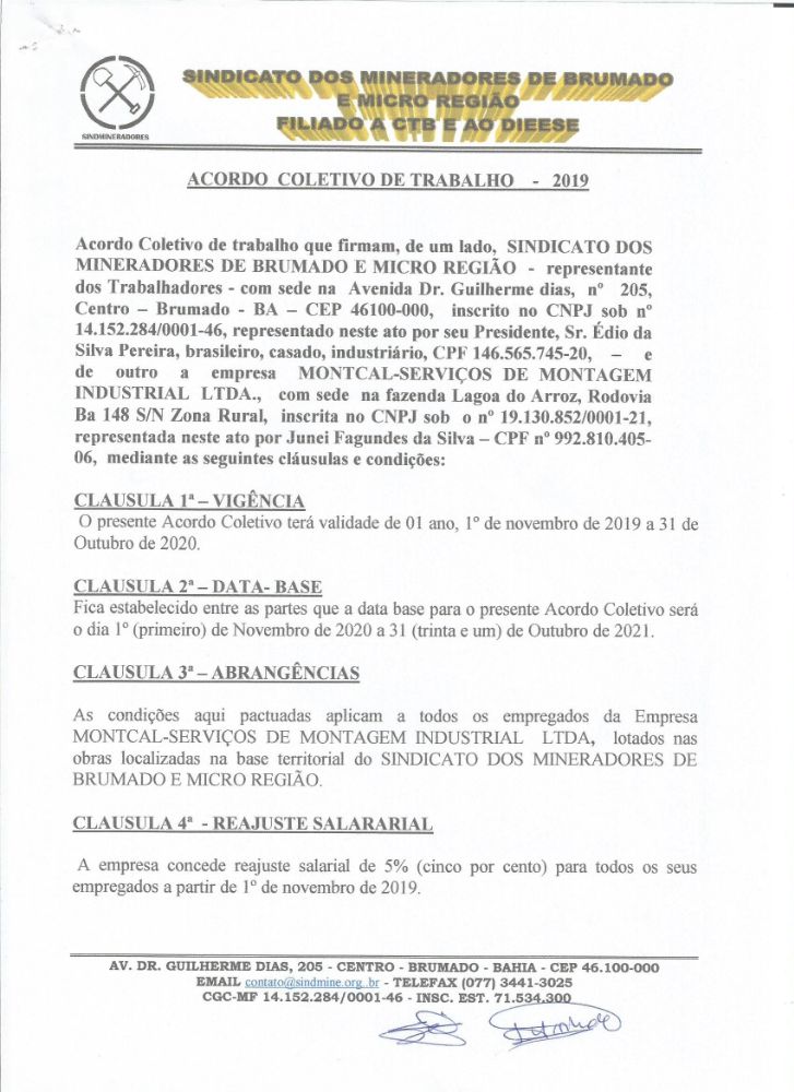 Acordo Coletivo de Trabalho - 2019 - Montcal Serviços de Montagem Industrial LTDA