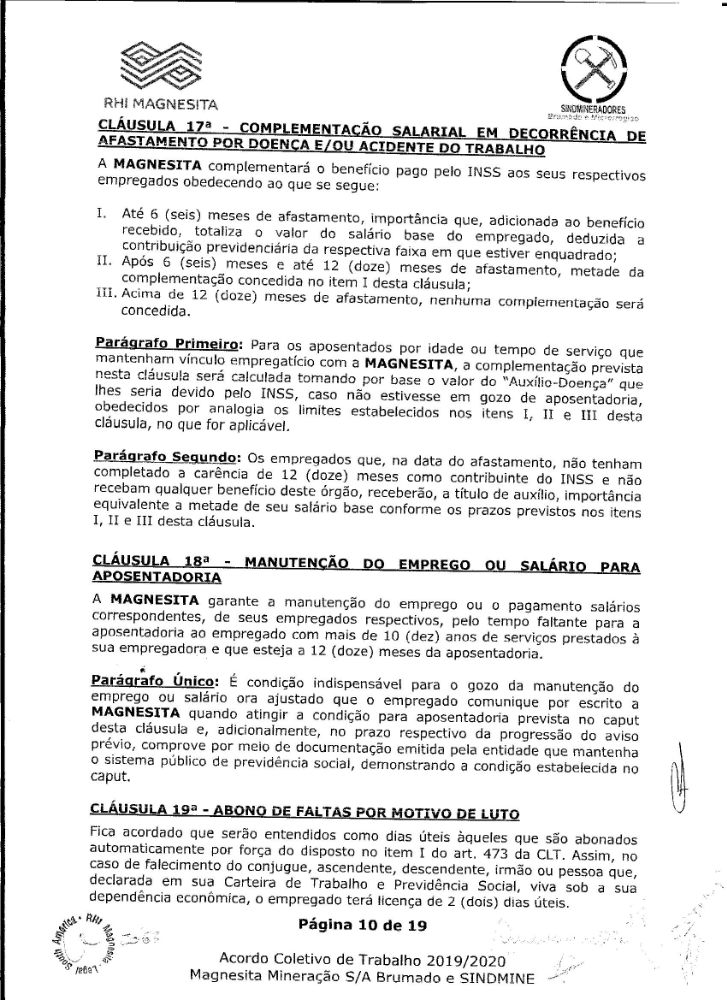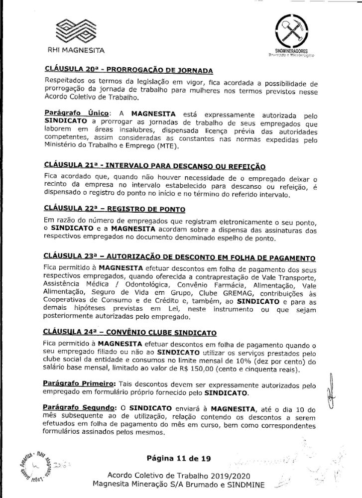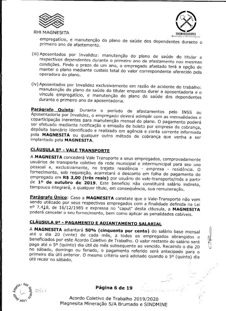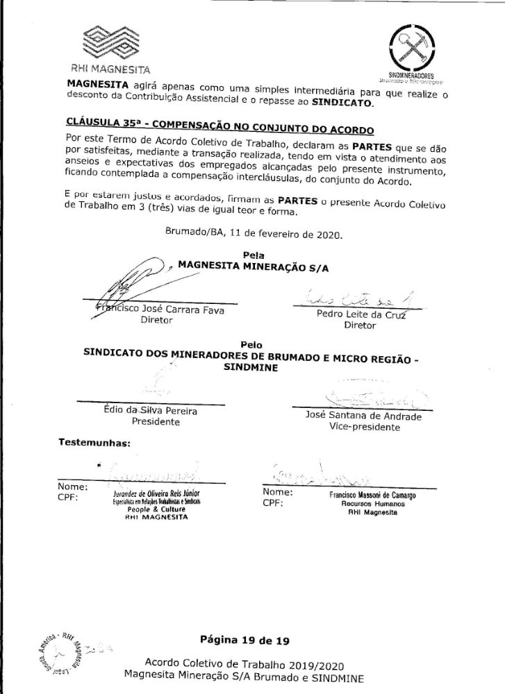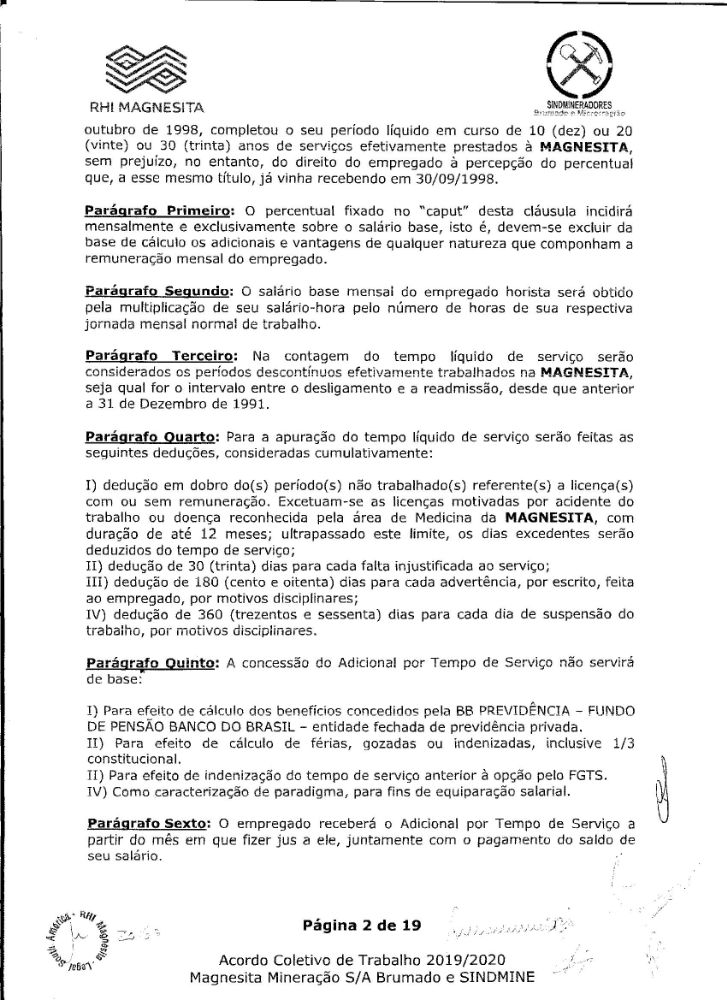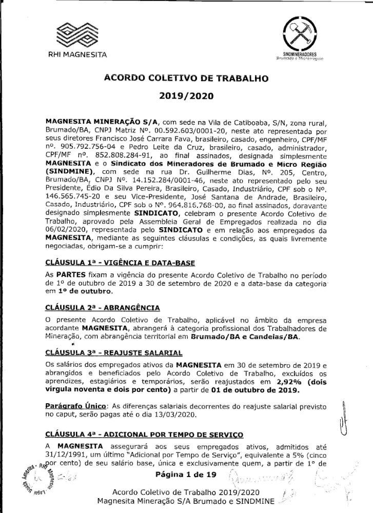 Acordo coletivo de trabalho 2019/2020 - Magnesita Mineração S/A