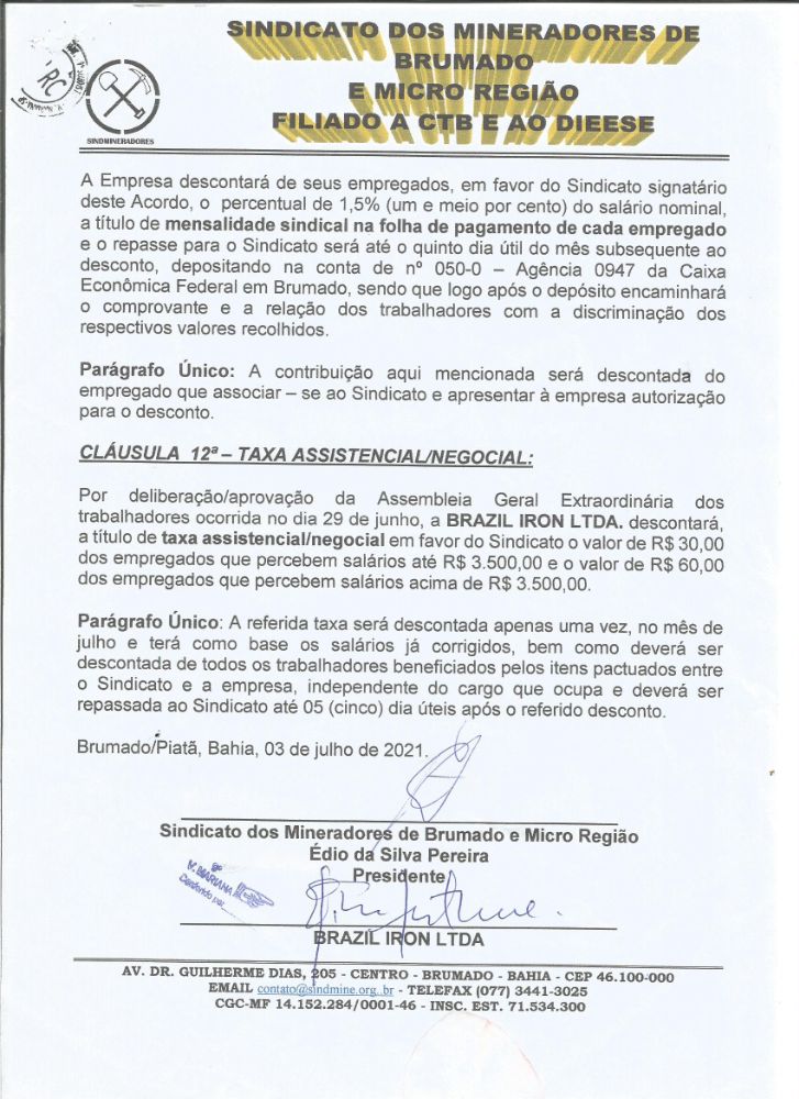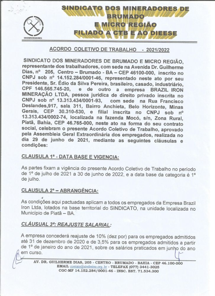 Acordo Coletivo de Trabalho 2021/2022 - Brasil Iron Mineração LTDA