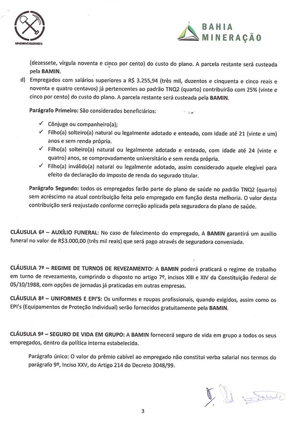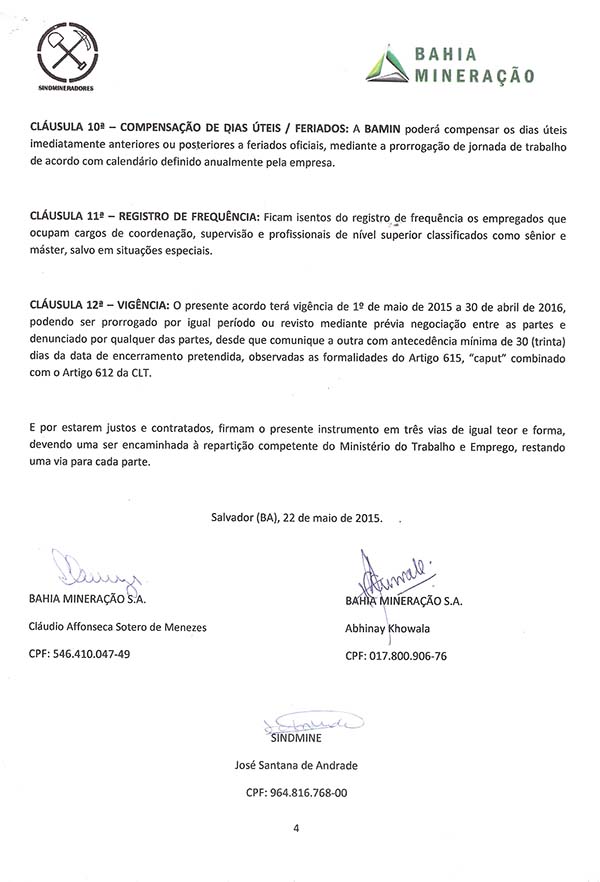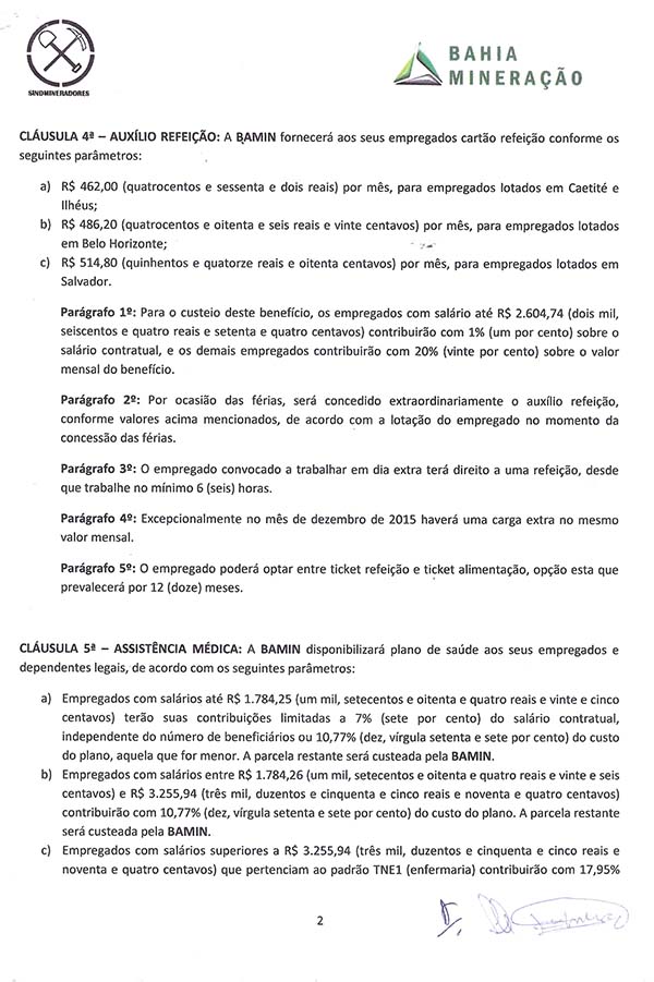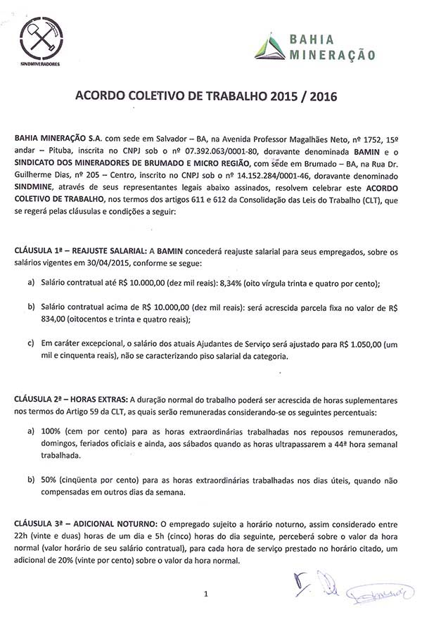 Acordo coletivo de trabalho 2015/2016 - Bahia Mineração S.A.