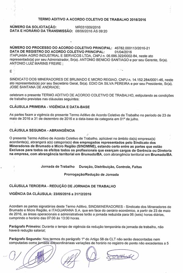 Termo Aditivo a Acordo Coletivo de Trabalho - 2016/2016 - Itapuama Agro Industrial e Serviços LTDA